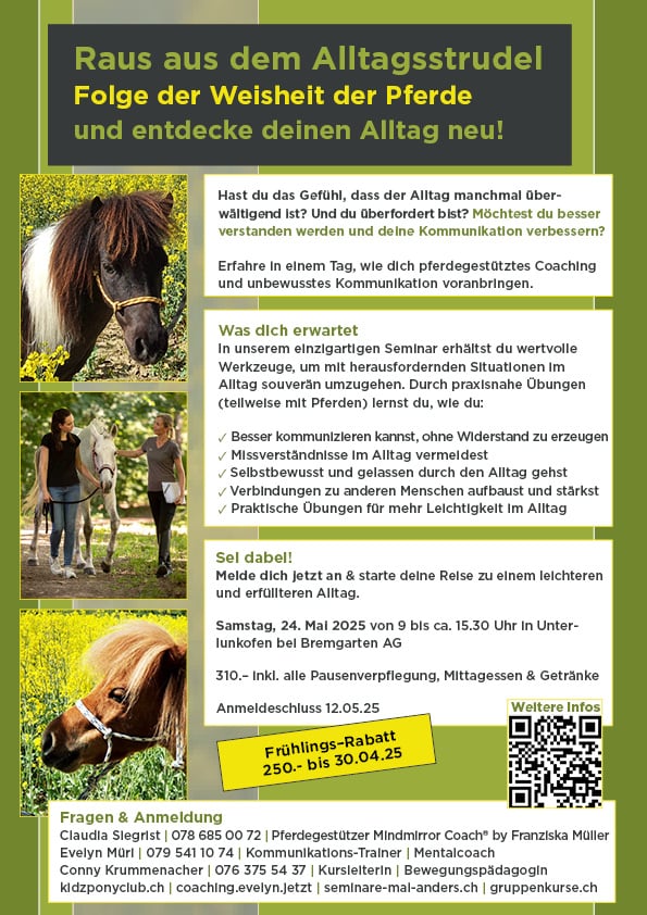 Und du wirst überrascht sein, wie leicht es dir fällt, das Erlernte sofort anzuwenden. Die Ponys unterstützen dich dabei, noch schneller Erkenntnisse zu gewinnen – sie spiegeln dich direkt und zeigen dir unbewusste Muster auf. Spüre die Veränderung und erlebe es selbst!